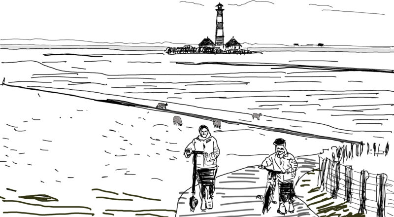 Titel: Leuchtturm mit Menschen (Westerhever, Nordsee)Gattung: digitale ZeichnungEntstanden: 11.2025Meine Bilder können bei printler.com/de erworben werden.Empfehlenswert ist dort der Kunstdruck der Größe 21×30 cm.